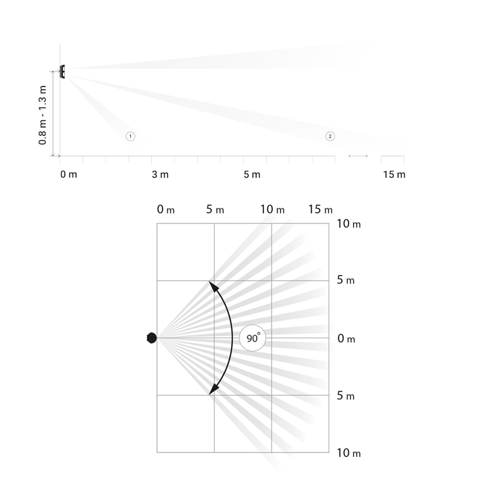 Campo de detecção | 15 m / 90º / Instalação 0.8~1.3 m |
